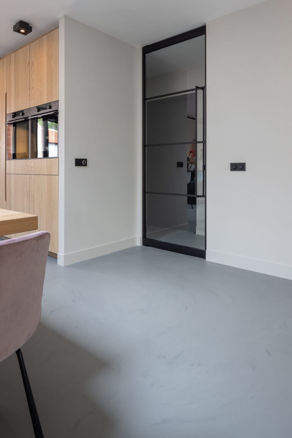 De eigenaren zijn erg blij met hun keuze: “We vonden het super spannend, maar zijn super blij met het resultaat. De wens was een strakke vloer, maar wel warmte. En we waren bang dat je alles op de vloer zou zien; maar door de vleug is dat helemaal niet het geval. En super hygiënisch, heel blij mee.”