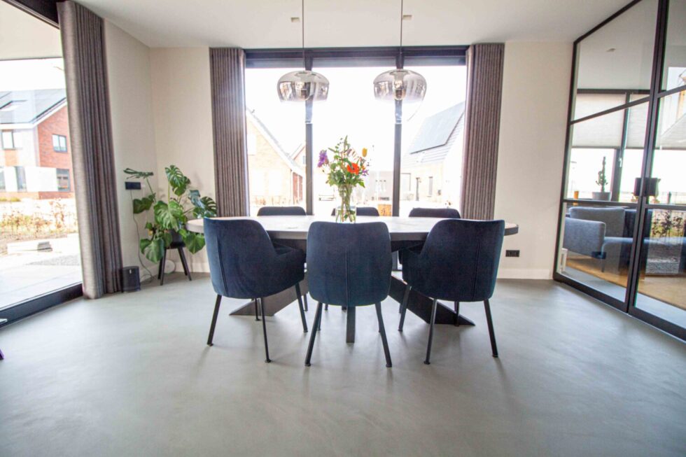 De huiseigenaren wilden een betonlook vloer voor hun zelfgebouwde nieuwbouwwoning. Een vloer met een ambachtelijke en robuuste uitstraling. De vloer moest tegelijkertijd onderhoudsarm en geschikt zijn voor natte ruimtes, zoals een keuken.
